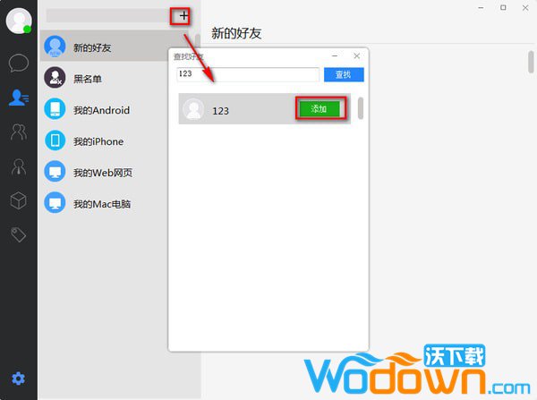 2.添加联系人:只需要点击上方的+即可添加联系人,在输入框中输入联系人的ID即可查找到对方。