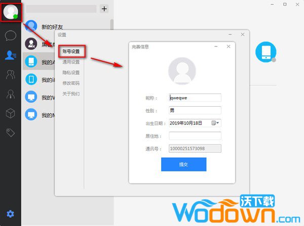 3.设置页面:点击左上角的头像即可进入设置页面,在账号设置处可以修改自己的个人信息。