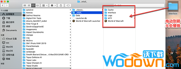 1、在左侧mac下载下载好插件文件夹,打开其中的正式服或者怀旧服文件夹,其中的Interface文件夹留待备用2、打开魔兽安装路径找到怀旧版Interface文件路径,/应用程序/World of Warcraft/_classic_/Interface (注意:_classic_下面那个_retail_是正式版路径,如果你是正式版,替换_retail_中的Interface文件即可对正式版游戏起效)