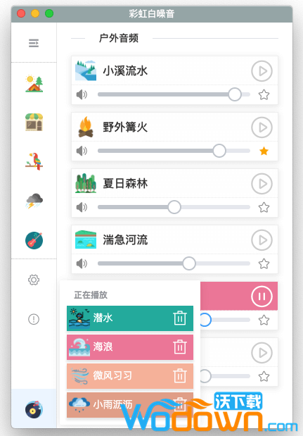 播放内容可自由控制新版本添加了 [正在播放] 功能,可以实时从左下角停止正在播放的内容。同时支持软件启动时播放上次退出的白噪音。