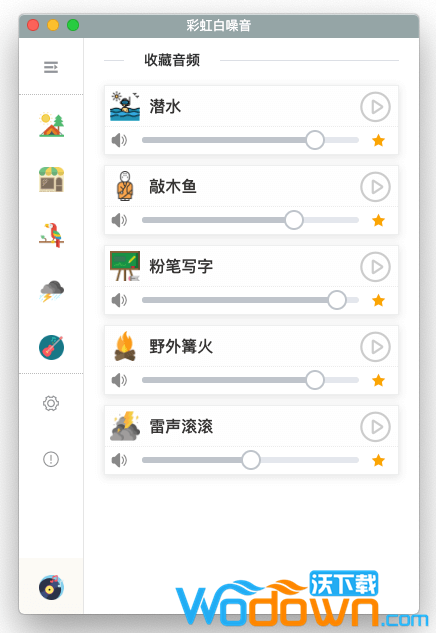 新增加收藏功能新版本添加了 [收藏] 功能,从左上角的导航进入。由于白噪音数量正在慢慢添加,收藏可快速找到喜欢的白噪音。