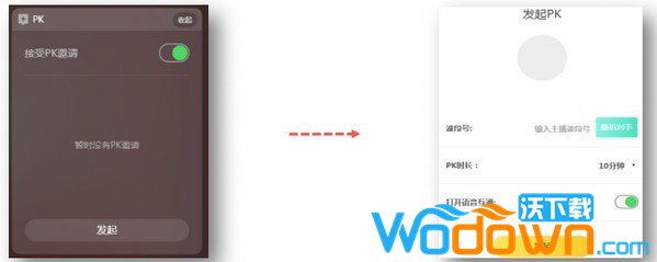 5.直播助手右侧可选择开启PK功能,接受别人的PK邀请或点击【収起】,収起一场PK,选择指定/随机对手、时长、语音是否互通等