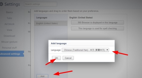 2.点击【add】按钮,选择繁体中文,点击【ok】。