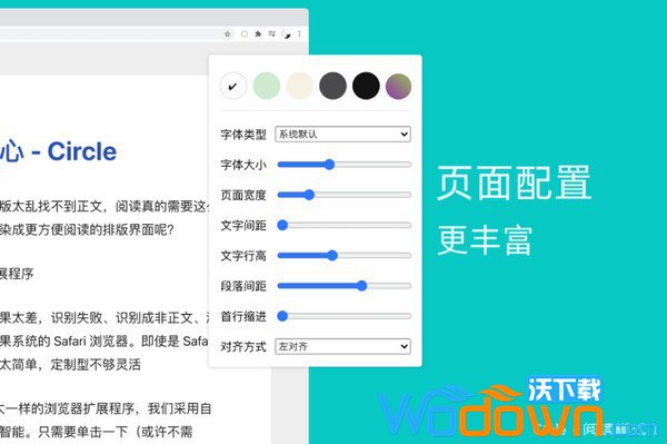 Circle(阅读模式) 支持自定义主题更丰富的页面配置页面字体,字体大小,行高,段落间距,页面宽度等等,统统允许你自己设置。如下图所示: