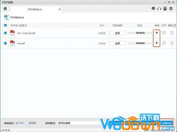 2、点击软件界面中间的图片按钮点击添加文件或拖拽文件到列表,或添加文件按钮,都可以进行选择添加需要转换的PDF文件到转换器列表中。3、添加完成需要转换的PDF文件到转换列表后,可以做一些简单的设置操作。如:按照自身需要选择转换格式类型(DOC或DOCX),以及选择转换后的文件保存目录,点击选择目录按钮即可选择希望将转换出来的word文档保存到指定的目录下。4、点击转换按钮或批量转换按钮,开始PDF转换成Word文件。如下图示: