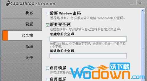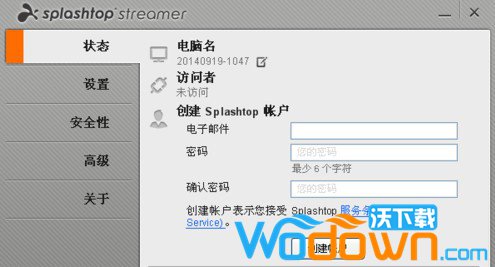1.首先下载并安装Splashtop Streamer,下载安装后可以看到一个很简单的小对话框画面,这里面我们主要关注两个栏目一个是状态栏,另外一个是安全性。状态栏里面我们可以把自己的splashtop帐户添加,一般是邮箱形式的帐户。而安全栏可以设定我们被远程控制的电脑,在被远程控制时的控制密码,避免被恶意控制。