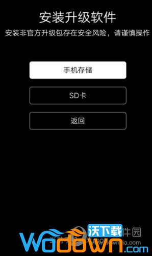 3、选择安装升级软件,界面会跳转,出现选择从内置存储还是外置SD卡升级,比如:下载的安装包放在手机U盘根目录,选择手机存储即可。