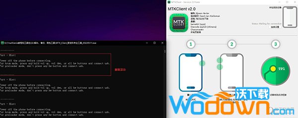 先将设备用USB连接电脑,然后插入电源时立刻按住所有按键,直到界面如下图所示,松开所有按键即可(第一遍提示音是进入brom模式,第二次提示音是进入preloader模式)
