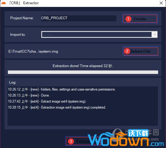 将备份好的system.bin和boot.bin拷贝到没有中文路径的目录里(有中文路径下一步打包会不成功),然后把扩展名改成.img继续下一步。5、解包system分区解压后打开CRBuilder.exe,点击解包,这时候软件会重新加载一下(闪一下),再次点击解包,在弹出的界面中点击Create,执行完毕点击Select File,选择上一步改好扩展名的system.img文件,点击Extract,等待执行完毕,点击右下角的Output Folder