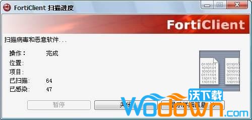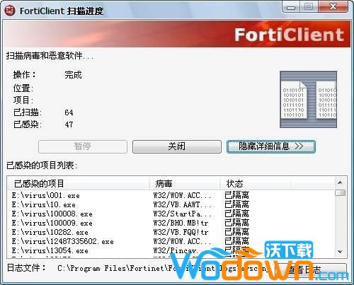 病毒样本实测环节,飞塔一共扫描文件64个,其中检测到病毒文件47个,具体耗时未知,因此该软件没有提供扫描过程自动计时功能。