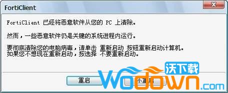 对于执行某些扫描任务中可能会遇到一些比较顽固的或者危险的恶意程序,飞塔在对这些病毒文件自动执行清理操作时会提示用户重启计算机以保证将其彻底清除。