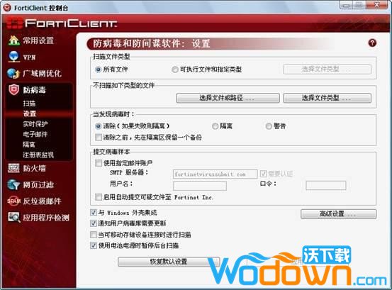 由病毒样本实测可知,飞塔默认设置下对检测到的病毒程序自动执行清除操作(如果清除失败,自动隔离病毒文件)。当然,该软件支持用户自定义其它处理方式。另外,该软件的扫描过程中默认将扫描所有类型的文件,用户也可以自定义扫描文件类型。该软件还支持用户自定义扫描过程中需要排除的文件或者路径。
