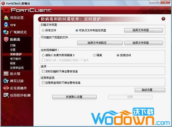 飞塔提供了实时保护服务,支持用户自定义需要实时保护的文件类型以及不需要保护的文件或路径,另外,该软件默认对实时拦截到病毒采取拒绝访问的处理方式,支持用户自定义其它处理方式。