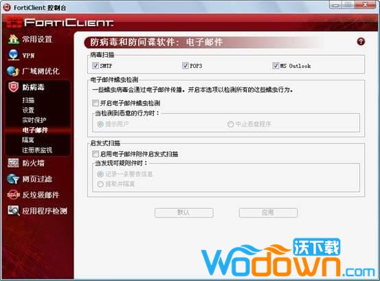 飞塔提供了电子邮件防护,能够提供对SMTP邮箱、POP3邮箱和Outlook邮箱的安全防护,同时,该软件提供了电子邮件的蠕虫检测服务,有需要的用户可以自行手动开启该服务。另外,该软件支持启用对电子邮件的启发式扫描。