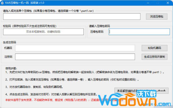 加密端使用方法:1、先把文件打包为带密码的rar压缩包,然后把压缩包和解密端一起发给别人(把解密端命名为压缩包同名,如果是分卷请不带 part1 )。2、打开加密端,拖入或者浏览压缩包(如果是分卷,请选择第一卷),输入压缩包的密码(你打包时设置的密码)。3、对方发机器码给你,复制后,粘贴到机器码框。4、点击生成注册码,发送给对方即可;对方输入后默认解压到压缩包所在目录。
