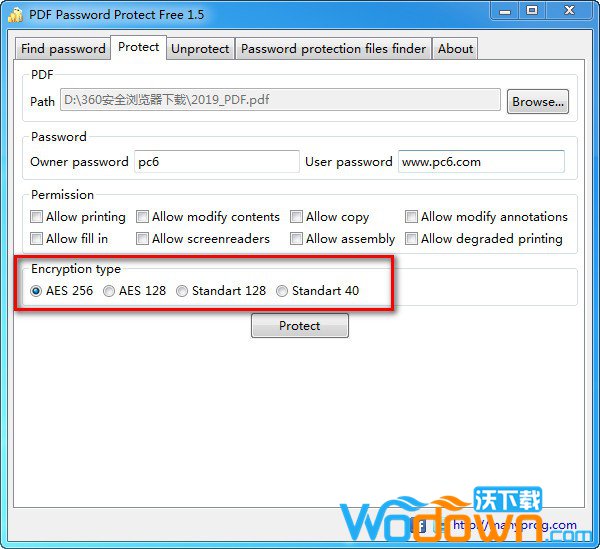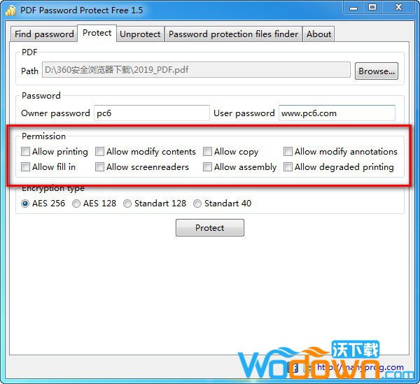 PDF Password Protect Free是一款免费的PDF加密软件,通过快捷的方式对PDF文件进行快速加密,操作非常的简单,支持批量处理加密。加密后的PDF文件只能通过密码才能正常访问,同时还可以防止编辑、打印、复制等操作。PDF Password Protect Free支持提供多种类型的加密:40位RC4、128位RC4、128位AES、256位AES。此外,AES加密被认为更可靠。