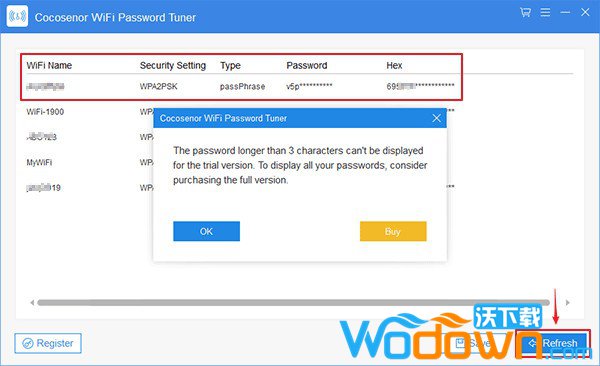 步骤1:运行软件步骤2:点击刷新恢复所有保存的WiFi密码点击刷新按钮。所有保存的WiFi密码将显示在界面上。您还可以获得以下详细信息:WiFi名称、安全设置、类型、密码和十六进制。注意:试用版不能显示超过3个字符的密码。建议购买完整版。