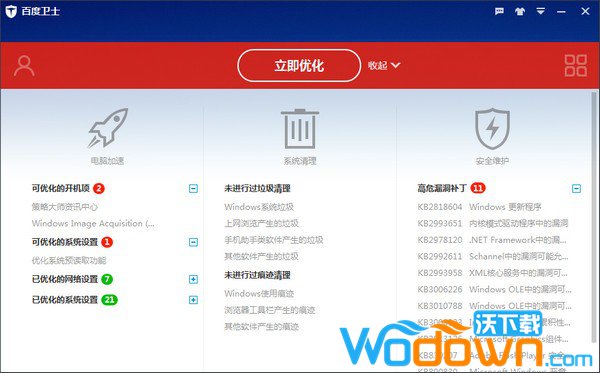 百度卫士主界面相当简洁,提供了电脑加速、系统清理、木马查杀三大主要功能。软件运行之后可以立即显示电脑健康状态,如果电脑状况不理想,百度卫士会显示用户电脑状态为亚健康,并告知用户需要被优化的项目。此外,软件右下角还集成了软件管理功能,可为用户提供软件下载、安装、升级和卸载。
