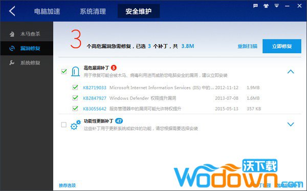 木马查杀则提供闪电云查杀、全盘查杀、自定义查杀三种查杀模式,满足您的个性化需求。