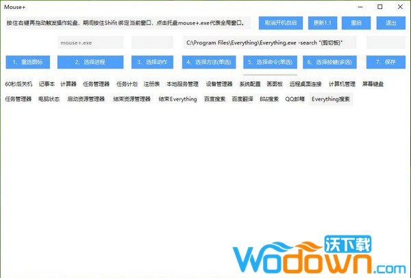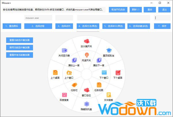 1、按住右键再拖动触发操作轮盘,期间按住Shifit绑定当前窗口,点击托盘mouse+.exe代表全局窗口。